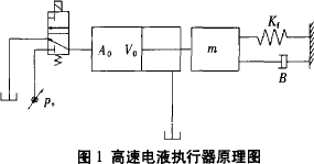 电液执行器一般由两位三通高速开关阀和液压缸组成,其工作原理如图1所示。在没有电信号时,高速开关阀在常闭位,液压缸的控制腔通过高速开关阀与油箱相通,液压缸在负载弹簧的推动下回到原位在有驱动信号时,高速开关阀工作在开启位,此时液压缸的控制腔通过高速开关阀与液压源相连,从而驱动高响应液压缸前进。