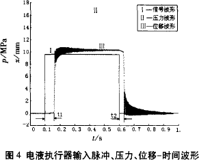 比较压力一时间曲线和位移一时间曲线可以发现在推进行程中,控制腔建压过程是导致电液执行器输出位移动作延迟的主要原因在回退行程中,控制腔卸压过程是导致电液执行器输出位移动作延迟的主要原因。因此如何在推进行程中快速建压和在回退行程中快速卸压是减少电液执行器动作延迟时间、提高电液执行器动作执行频率的主要途径。