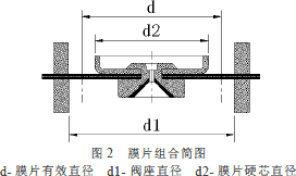 影响膜片组合设计的主要是膜片硬芯直径和膜片厚度,不仅要考虑它们对膜片中心扰度的影响,还要考虑其对膜片应力的影响,以确保最大应力值不超过许用应力。膜片硬芯的直径d2建议为膜片受力直径d1的2/3以上,膜片最好有弧形位,这样可以在上下移动时有伸缩余量。硬芯在设计时在接触膜片一侧要有环形突起,组合时要保证结合位密封,不能漏气。主调压座要压紧膜片,不允许气体泄露。膜片与本体、主调压座的接触位,后两者要有圆弧过渡(R>3毫米),可以保护膜片不易断裂。但圆弧又不能过大,否则膜片受力面积增加太多,增加了对膜片强度的要求。