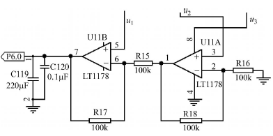 u1,u2由电源模块部分的分压电路引出(引出点已经标注在图1上),同时为了保证低功耗,尽量减少非线性,采用了LT1178运算放大器,此运放形成减法电路,保证了输出端能精确的反应输入电流的变化,完成输入电流的采样,计算过程如下: