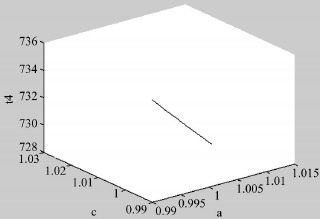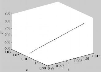 由电阻的精确度可知道a的范围[0.99 1.01],同理c的范围也为[0.99 1.01],所以在a与c同方向变化的情况下用matlab仿真的曲线如图3所示(3维坐标图型,a为横坐标,c为纵坐标,t4为竖坐标,U