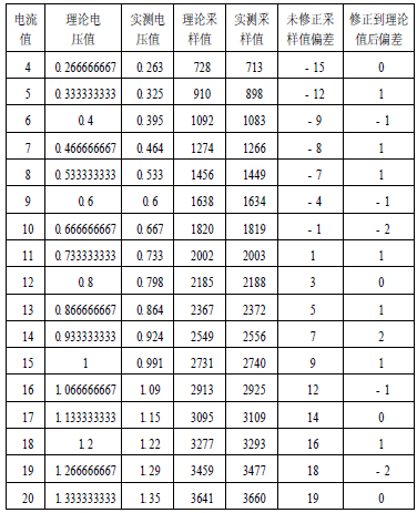 为了验证仿真结果,随即抽取一块样板,实际补偿是以4mA到12mA直线补偿,和12mA到20mA直线补偿,补偿后如表1。