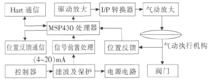另一方面,气动执行器机构部分的直行程或角行程的变化,经反馈连接杆带动高灵敏度的阀位检测反馈传感器旋转(10k精密电阻式传感器),从而引起其电压的变化,此变化量经差动运放等电路处理后,送入微处理器进行AD采样,经“归一化”数据处理,得到对应的实际阀位变量值。