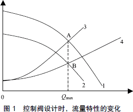 图中,曲线1是采用传统控制阀设计时,供能设备的流量特性,曲线3是传统控制阀设计时控制阀和管路的流量特性,交点A是控制阀全开,最大流量时的工作点。曲线2是根据控制阀设计的逆方法设计时,供能设备的流量特性,曲线4是逆方法设计的控制阀和管路的流量特性,交点B同样是控制阀全开时,最大流量时的工作点。可见,由于采用大流量系数的控制阀,为达到做需的最大流量,供能设备的供能能力可降低。