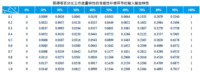 ③ 由于压降比s小于1,因此,应在上述补偿位置插入补偿环节,补偿环节的设计原则是使被控对象放大系数与控制阀放大系数、非线性补偿环节放大系数三者之积保持不变,因此,非线性补偿环节的放大系数是被控对象放大系数的倒数与控制阀放大系数的倒数之积。下表列出当要求控制阀工作流量特性为等百分比特性时,不同s下非线性补偿环节的输入输出特性。