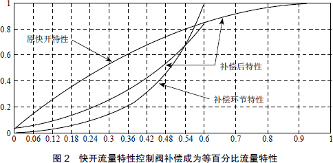 对采用快开阀的应用场合,例如,为降低成本,或工艺管径大等,常常采用具有快开特性的控制阀作为节流控制,因快开阀流量特性在60%开度以内接近线性,因此,在这类应用场合,可采用分段非线性的处理。使经补偿后的控制阀流量特性在0~60%范围内满足所需的等百分比特性,在60~100%开度范围内与原快开特性相同。图2显示用快开特性增益与补偿环节特性增益相乘后获得的等百分比特性与快开特性的组合曲线。