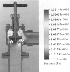 消防阀在全开时(图2、图3),由于阀瓣的阻挡,在阀瓣处流速和压头的变化比较复杂,流体的压头和流动能力进行着复杂的转换。在①的部位压头有所增加同时流速降低。在②的部位压头能量消耗在液体的流动上,使液体的流速增加,对阀瓣形成了一定的冲击。