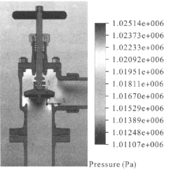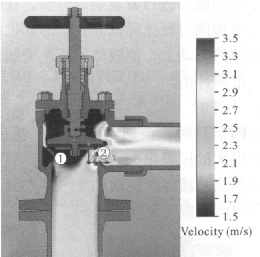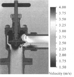 消防阀半开时,流通面积缩小,流道突然扩大,产生很大的压差损失。这时,流体部分流速消耗在形成涡流及流体的搅动和发热等方面,阀后会出现局部涡流现象(图4、图5)。