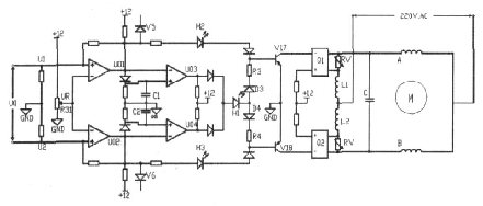 执行器有偏差时,控制电压U0≠0,当U1>UR则U01为高电平,开关管V17饱和导通。固态继电器Q1导通,电机A相绕组为控制相,B相绕组通过分相电容C成为激磁相,电机正转。随着执行器运行到平衡位置,偏差减小,U1<UR,U01翻转为低电平,同时U03输出一个正脉冲,这个脉冲通过D3、R3及D4、R4使V17和V18同时导通,则固态继电器Q1和Q2也同时导通。两个固态继电器同时导通时间,由电路中C1和C2容量大小形成的脉冲宽度而定,一般几十毫秒。此时电机内部旋转磁立即变成不旋转的脉振磁场,转子惯性旋转时,转子导条切割磁力线产生感应电流,同时在转子上产生感应电流磁场,这两个磁场相互作用,使转子立即停转。反之,控制电机电压U2>UR时,B相为控制相,A相变为激磁相,电机反转。同理执行机构运转到平衡位置时,电机亦立即停转。整个制动过程是将转子动能转换成电能,再消耗在转子绕组(导条与短路环构成)上,故为能耗制动。