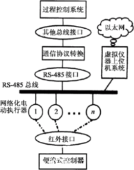 如图2所示,网络化电动执行器系统主要包括网络化电动执行器、现场总线转换、便携式控制器和上位机系统等4部分。网络化电动执行器根据给定量与反馈量的偏差控制电机运行;现场总线转换是通过通信协议转换,实现RS-485总线与其它不同现场总线的转换连接,便于网络化电动执行器匹配各类型过程控制系统;便携式控制器是用于实现网络化电动执行器各项参数简便设定的设备,可以通过红外通信实现执行器各项参数快速设置;基于虚拟仪器技术的上位机系统是网络化电动执行器远程管理平台,可以通过RS-485总线实现电动执行器的操作和管理,并可以接入以太网实现远程控制。