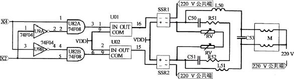 M为电机绕组,R51,R52,C50,C51是吸收电路,RV是氧化锌压敏电阻,共同起到保护固态继电器的作用。对电机绕组加交流电源,测得电压U、电流I、频率f,电机绕组阻值R,根据式(1)可以计算出电容C53配置的理论值