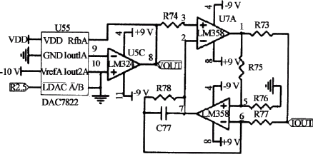 将DAC7822的参考电压端子VrefA接-10V时,经过运放U5C的转换,可以获得正电压输出。MSP430F449单片机向DAC7822输出的数据在409~2048间变化时,可以在Vout端获得1~5V电压信号输出。运放U7A,U7B和R73,R74,R75,R76,R77,R78,C77构成电压电流转换电路,将1~5V电压信号转换为4~20mA电流信号在Iout端输出,实现DDZ-III型信号的输出。