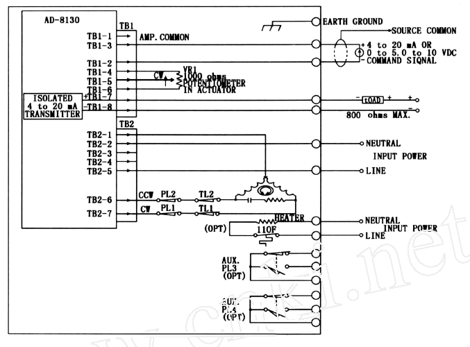 AD-8130伺服放大器主要用于实现执行器信号控制,它的输入信号包括:控制信号,反馈电位器信号VR1,力矩及限位开关信号,具体接线。执行器原理见图1。