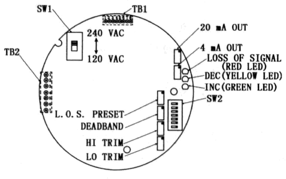 (2)输入4mA信号,调整电路板上零点电位器(LO TRM)直到执行器全关为止。此时DEC(黄)LED应熄灭,关行程开关应动作。