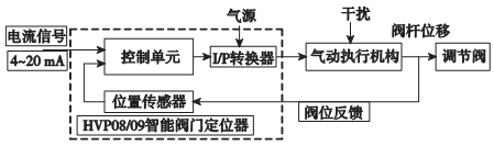 图1中,HVP08/09智能阀门定位器与气动执行机构组成一个闭环控制回路,阀杆位移作为被控量,位移量通过位置传感器反馈到阀门定位器的控制单元。控制单元根据位移量与给定信号值的偏差,控制电/气(I/P)转换单元的压力输出,从而控制调节阀。HVP08/09智能阀门定位器,能很好地克服摩擦力和阀芯上的不平衡力,使其定位更迅速、精确。