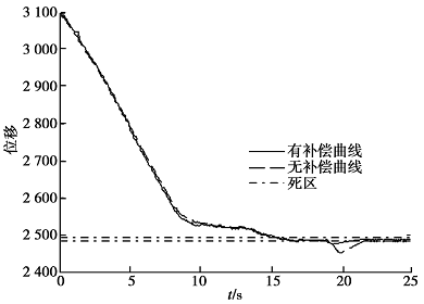 有时由于气体泄漏的原因,阀门稳定后又会出现向下滑动的现象,需要再充一部分气才能稳定到目标位置,为此当检测到阀门向下滑动时,要对控制量进行补偿,补偿量是在自检过程中确定的。该阀门在稳定后,有向下滑动的现象,控制阀门开度从量程100%排气到75%,有、无补偿作用的对比曲线如图7所示。