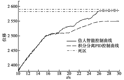 图6中,积分分离PID控制曲线在2 500左右,速度接近为零,这时依赖积分作用增大控制量来克服静摩擦力,故会出现长时间静止或移动一定距离又静止的现象。而仿人智能控制通过切换模态进行参数切换,能够快速进入死区,满足定位要求。