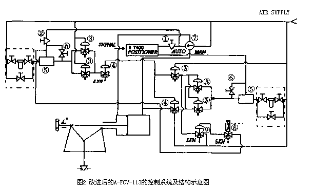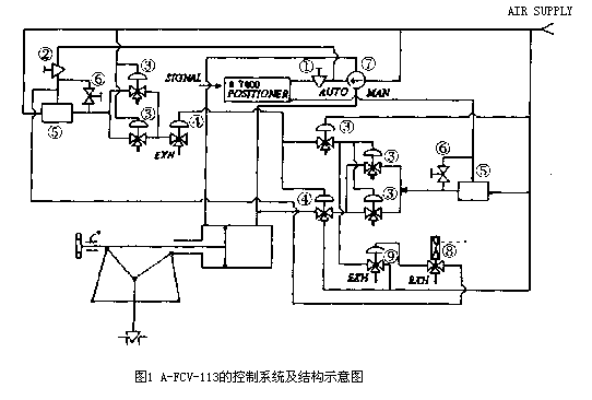 A-FCV-113的工作原理为:仪表空气经减压阀,通过升压器进行流量放大,再经过自锁阀、气动切换阀进入气缸活塞左侧;POSITIONER的输出信号,经过升压器的放大,通过自锁阀、气动切换阀再进入气缸活塞的右侧,随着POSITIONER输出压力的变化,推动活塞从而带动阀芯动作。