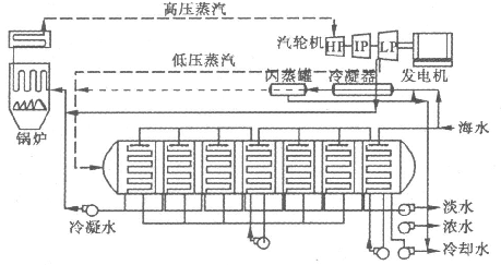 蒸馏法的海水淡化原理简单,即将海水加热,待水蒸汽冷凝后得到淡水。蒸馏法依据所用能源、设备及流程的不同,分为多级闪蒸(Multistage flash distillation,MSF)、低温多效(Multip le effect distillation,MED)和蒸汽压缩蒸馏(Vapor compression,VC)等。其中,低温多效在70℃以下进行操作,远低于多级闪蒸110℃左右的蒸汽温度,有效地避免了无机盐的结垢,是目前最为适用的蒸发技术之一。同时,它可利用各种形式的低位热源,如与火电厂或核电厂结合,利用蒸汽轮机的背压0.02~0.04MPa(绝对压力)抽气造水,减少发电损失,提高发电机组的效率(图3)。