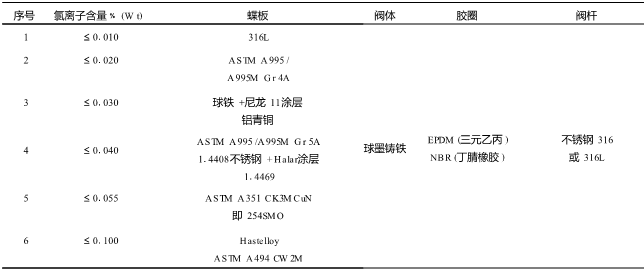 海水含盐量在3%以下,pH值约为6.5,氯化物0.01%(Wt)左右时,可以采用316L不锈钢。对于其他工况,可按氯离子浓度来选择蝶板的材质。0.02%(Wt)以下,可选用ASTM A890/A890 M Grade 4A双相不锈钢。0.04%(Wt)以下,除了推荐用1.4408不锈钢+Halar涂层蝶板外,也可选用ASTM A890/890M Grade 5A的双相不锈钢(表3)。0.04%~0.05%(Wt)时,为了应对最严格的腐蚀工况,一般选择超级奥氏体不锈钢材蝶板,如254SMO(ASTM A269 S31254)、1.4529和AL6ZN(ASTM A240/A240M N08367)(表4)。
