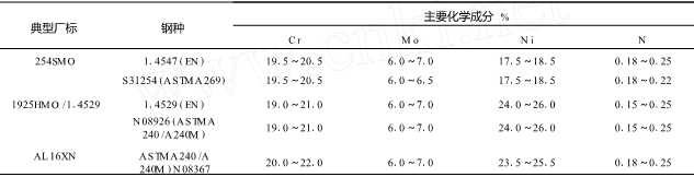表4中的超级奥氏体不锈钢化学成分中1.4529和N08367的含镍量约为25%,而254SMO只有18%,但它对耐氯离子腐蚀性上几乎没有影响。试验结果证明,254SMO的点腐蚀电位高于AL16XN,具有更好的耐点蚀能力。由于镍在现阶段处于高价位,所以采用254SMO会带来更佳的经济效益。