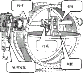 连杆蝶阀的结构如图1所示,它主要由驱动装置、阀板、阀体、主轴、杆系等零部件组成。调节阀的启闭是靠驱动装置驱动主轴带动杆系机构运动,从而实现阀板的打开和关闭。通过图1可以看出,无论阀门在开启还是关闭的时候,阀板及其连动部件始终是在介质的包围之中。当阀门关闭时,阀板要承受介质的所有压力,这样就会引起阀板的塑性变形,进而使其连动件引起变形;当阀门开启时,阀板又会受到介质的冲刷,以及介质流动所引起的阀板本身的振动,这样同样会加快连动部件的损坏,尤其是铰接处固体自润滑轴承的损坏。因此,连杆蝶阀阀板的寿命也就是连杆蝶阀的寿命。