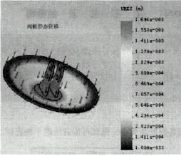通过上面从不同角度对阀板结构的分析,了解了传统阀板结构的不足之处,通过现场实践及用计算机的模拟分析,最后把阀板的结构改进为如图5结构。虽然只是对原来的结构作了很小的调整,但是这给加工制造带来很大的方便,对于一个系列的产品,可以将大圆钢板设计成一个弧度,这样只用一套胎具就可以满足设计要求。同样阀板的刚度和强度也都有很大的提高。图6是对改进后的DN1700连杆蝶阀阀板施加0.4MPa压力分析出来的结果(注:改进后的阀板大圆钢板、垫板、立板与传统阀板上各件的厚度相同)。阀板的最大位移仍然发生在立板这个框架上,但只有0.13mm的变形量,是传统结构阀板变形量的1/13。由于销轴与固体自润滑轴承之间有一定的的设计间隙,所以这样的变形量,不会影响阀门的正常使用。