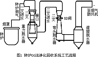 转炉烟气净化与回收系统(Oxygen ConverterGas Recovery,通常简称为“OG”系统)的工作直接影响到转炉烟气的回收效果、设备的寿命、现场的安全等。目前转炉烟气回收系统主要采用的是文氏管湿法除尘,基本原理是当转炉烟气通过文氏管收缩喉口时,产生较大而且相对稳定的气流阻力损失,使含尘烟气流流速升高,在喷水的作用下烟气与水进行水气混合,使尘粒从气流中分离出来,达到烟气除尘的目的。如图1 所示。