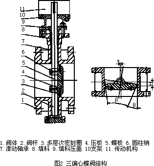 调节阀三偏心结构如图1所示。双斜面多层次金属三偏心蝶阀的结构如图2所示。