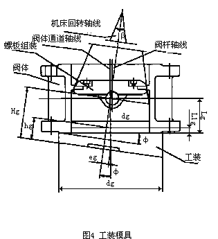 从图4得知,将工件倾斜一个φ角度,车刀旋转ψ角度。车刀旋转β/2角度。工装中机床工作面至夹具中心高Hg和机床回转中心线至阀体通道中心线的距离eg是两个非常关键的参数,计算如下
