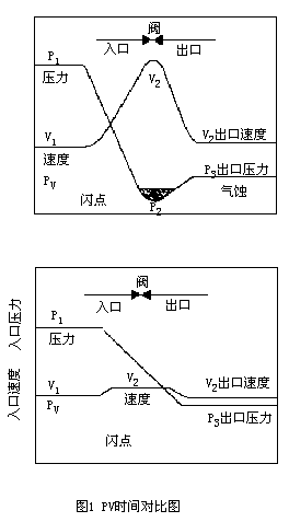 当流体压力降到蒸汽压以下时,就会出现闪蒸和气泡。采用传统阀门时,流体进入分离器的压力为P1,速度为V1,当它经过阀心的压力降区后,速度上升到V2,静压降到P2,低于可以使流体发生汽化的蒸汽压。