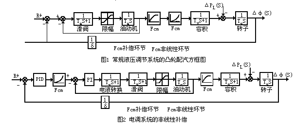 在图1和图2中,R为转速给定;ΔPL(s)为负荷扰动;Δφ(s)为转速变化;Td为电液转换器时间常数;Tk为滑阀时间常数;Ts为油动机时间常数;Tv为容积时间常数;Ts为转子时间常数;δ为调速不等率。