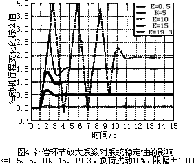 由此可见,油动机滑阀运动的限幅,随着补偿环节放大倍数的变化,将影响系统的稳定性。通过仿真试验对油动机滑阀不同限幅时的特性进行了研究,滑阀限幅分别为:±1.05、±1.10、±1.15和±1.30时,补偿环节的放大系数K分别在:7.05、7.41、7.76和8.86时抽动机滑阀开始限幅,对系统的动态响应特性发生影响,当K值分别达到:20.28、21.25、22.22和25.11时系统处于临界稳定,K值继续增加时系统不稳定。不同限幅和补偿环节放大倍数时的动态响应特性曲线与图4相似。