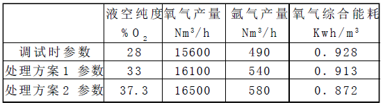 在V3阀因震动不能继续开大的情况下,为增加进上塔的液氮量,在杭氧专家的技术指导下,我们在塔外V355阀和V354阀处连接一根长约23米、直径30mm的V3阀旁通管(V355和V354的通径是Φ25),增大下塔进上塔的液氮量。投用后取得了一定的效果,氧气的产量由旁通阀启用前的15600Nm3/h提高到16100Nm3/h;氧气纯度由~99.2%O2提高到~99.5%O2有明显上升,但因旁通管管径过小且塔外安装,保冷情况不如冷箱好,加上这部分液氮是没有进行过冷器的,液氮汽化率较高,还不能完全解决V3阀开度小,液氮流通量少给主塔工况带来的影响,具体数据见表一,机组氧气产量和纯度不能完全达到设计工况,产品产量与设计值还有一定的差距。