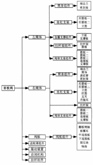 盲板阀在设计过程中遵循一定的设计流程,它的结构比较复杂,在进行参数化驱动时难以整体驱动完成造型和自动装配。通过对盲板阀结构的研究分析和总结归纳,依据其设计过程中零部件的生成顺序,将其结构按装配和设计关联关系进行零部件层次结构划分,如图2所示。在构建的设计流程导航下,依据该层次结构将盲板阀设计的相关知识与三维模型相结合,通过调用不同的三维模型及其相关的驱动参数,可以完成不同类型盲板阀的结构设计。