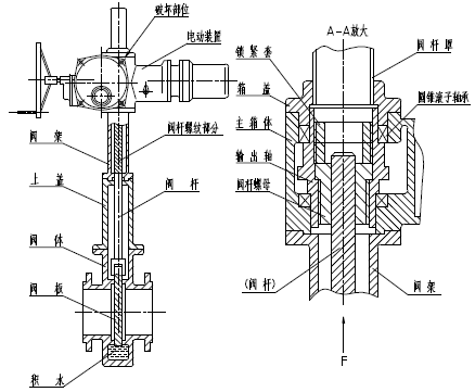 图1所示为阀门的主结构剖视,其中A-A放大剖视体现了电动装置输出轴部套,它是独特的Limitorque电动装置结构。