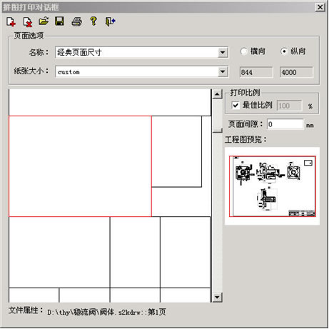 点击工具菜单下的“拼图打印”,自定义纸张的大小,选中所有需要打印的图纸,系统自动将图纸按照最省纸的方案排列,如图四。为使显示清晰,拼图打印中仅用黑色的线框表示大小不同的图纸及布局,点击图纸后从右边的工程图预览下可以看到该图纸的内容。图纸的位置可以进行手工调整,然后可以一次打印出图。拼图方案还可以保存到文件,以便下次打印。
