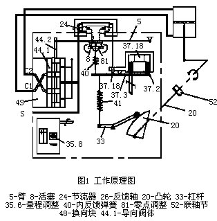 该电气阀门定位器是基于力矩平衡原理工作的,见图1,动力线圈位于永久磁铁磁场中,并在力平衡臂上产生一个和输入的电流信号成比例的扭矩。反馈弹簧(41)产生一个与执行器位置成比例的联轴器(52)反馈轴(26),凸轮(29)和把相应的位移传递到反馈弹簧(41)的末端的杠杆(33)来传递的,喷嘴感受平衡臂上的力矩。当输入信号增加时,则力平衡臂靠近喷嘴背压升高,这将引起膜片活塞(8)、平衡臂(5)和滑阀阀杠(44.2)向下移动,导向阀(44)把压缩空气S经通道C2分配到执行器活塞的上侧,在经通道C1由导向阀排除,执行器活塞移动直到平衡状态,在这个点上该执行器的位置正好与输入信号相对应。弹簧(40)引起在第一放大级(喷嘴和节流器24)第二级(导向阀44)之间一个负反馈,靠改变平衡臂上的弹簧(40)连接点,则定位器的公套特性与执行器的尺寸相对应。该定位器零点调整(61)是机械调整,而量程调整(35.6)属于电气调整。
