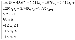W =49.674–1.111x1+1.076x2+0.416x3 + 1.291x1x2–2.749x1x3-1.736x2x3,