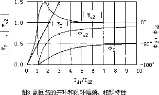 根据式(1O)和式(11),将副回路在开环和闭环下的频率特性绘于图3,图中|W2|,φ2和|W2|,φc2是副回路分别在开环和闭环下的幅频相频特性。可以看到,闭环副回路的相角滞后总是小于开环时的相角滞后,因此组成串级系统后就自然地提高了工作频率,使控制品质得到改善。