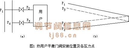 图1(a)为热用户平衡阀门安装位置及各压力点,如果用户供水管安装平衡阀调网,则P3近似等于P4,P2压力线见图1(b),近乎平行P4。如果用户回水管安装平衡阀凋网,则P2近似等于P1,P3压力线近乎平行P1。户内实际供水压力为P2,回水压力为P3,如果压力过低会倒空,压力过高会导致铸铁暖汽片超压。因此,晋城市平衡阀全部装于回水管的做法是错误的。正确的做法是:对地势比较低的建筑可装在供水管上,消耗压头后保证户内不超标,在地势比较高的建筑可装在回水管上,以保证户内不倒空。在供热半径很大,外网供回水压差很大时,应该在入户供水管安装自力式流量平衡阀,在地形高差不超过10m的建筑群的分支回水管上安装手动的平衡阀。这里自力式流量平衡阀负责控制分配流量,手动平衡阀调整压力,使阀前压力达到0.25MPa的满水运行工况。