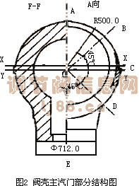 阀壳汽门部分长约1241.7mm,基本系由内腔和外形不同心的两个圆柱和一个进汽口圆柱构成,由于两个圆柱偏心57.2mm,使壁厚形成从216~350mm的过渡。而且汽门主体与进汽口及调门部分采用半径从250mm到450mm的圆弧过渡连接,(即图2中从OA至OE截面), 由此产生壁厚的不规则变化。
