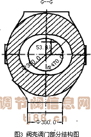 调门部分长约1300.3mm。主要由二个长轴相互垂直的椭圆(外轮廓)及腰圆(内腔)构成,其中椭圆长轴968mm,短轴854mm,腰圆长轴577.6mm,短轴470mm,壁厚形成从138.2mm~249mm 的过渡。调门部分的端面为一个Ф380mm的圆孔,此处原设计为封闭的盲孔,后因其不利于铸造及探伤检测等原因,改为通孔结构。结构如图3。