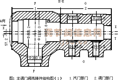 该阀壳主要由一个主汽门和二个调节汽门组成,从结构上可分为汽门和调门两个部分,最大外形尺寸为2542×1528.8×1250mm,除外轮廓的弧形表面外,其余均为加工面。其最大壁厚约350mm,最小壁厚为115mm,结构如图1。