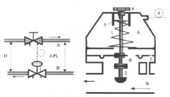 动态压差控制阀是基于弹簧-隔膜组合的方法进行设计的。弹簧拉动平衡双阀芯“2”打开阀门,压差AB施加在隔膜“3”上,产生一个与弹簧相反的力。压力A通过与测量阀的排水管相连的毛细管传到压差控制阀上;压力B从内部或外部传到隔膜的另外一侧。当压差AB作用在隔膜上的压力大于弹簧力时,阀门开始按比例关小,直到找到一个新的平衡位置。这样,在压差控制阀上产生一个附加压力降,限制了压差△PL(通过二次回路的压差)加大。