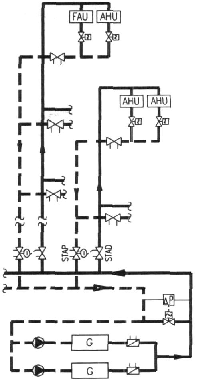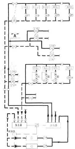 定流量系统是早期的空调工程中常见的水力系统,这里不再阐述平衡阀在定流量系统中的应用。近年来,随着空调系统的大型化及《公共建筑节能设计标准》GB50189-2005的实施,越来越多的空调工程中都采用了变流量系统。