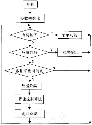 电动执行机构控制单元软件采用C30语言设计,包括初始化、数据采集、智能控制算法、电机驱动、键盘/显示、故障检测/报警输出、菜单功能、串行通讯中断子程序、定时中断子程序等功能子程序构成。其中数据采集子程序完成阀位信号的定时采集,故障检测/报警输出子程序负责限位、电机过热、电机过载等报警信号的检测和报警输出,电机驱动子程序根据智能控制算法子程序的输出实现电机正反转起停控制,键盘/显示子程序实现键盘扫描和显示刷新。软件主程序流程图如图4所示。