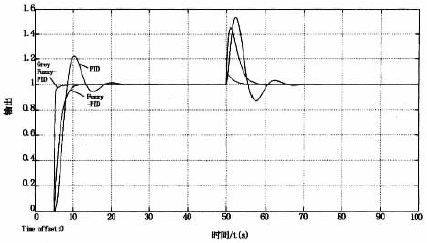 M的值取为5,建模维数n=5。其仿真结果如图5所示。图6为在对象在50S时加入单位阶跃的干扰的仿真结果。其中,Grey,Fuzzy-PID为采用灰色预测的模糊-PID控制响应曲线,Fuzzy-PID为采用模糊-PID控制响应曲线,PID为常规PID控制响应曲线。3种控制策略的参数均相同。从两图中可以看出,采用改进型灰色预测模糊-PID控制策略的阀位控制系统的动态品质明显优于采用常规PID控制策略的系统,同时,其上升时间和调节时间也比常规PID控制策略要短一些,且几乎没有超调量。