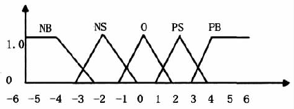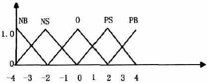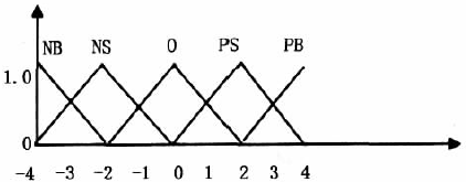 由此,对于输入变量的论域取为:{-4,-3,-2,-1,0,1,2,3,4},其模糊集合记作:T(c)={NB,NS,O,PS,PB}。其隶属度如图2所示。
