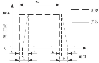 图中t1为线圈的磁滞时间,t2为阀芯开启动作时间,t3为线圈的消磁时间,t4为阀芯关闭动作时间。tn=t1+t2为开关阀的开启时间,tf=t3+t4为开关阀的关闭时间。